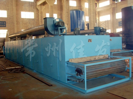 物料由加料器均勻地鋪在網(wǎng)帶上,網(wǎng)帶一般采用12-60目不銹鋼絲網(wǎng),由傳動裝置拖動在干燥機內(nèi)移動。干燥機由若干單元組成,每一單元熱風獨立循環(huán),部分尾氣由專門濕風機排出,廢氣由調(diào)節(jié)閥控制,熱氣由下往上或由上往下穿過鋪滿物料的網(wǎng)帶完成熱量與質(zhì)量傳遞的進程,帶走物料的水份。網(wǎng)帶緩慢移動,運行速度可根據(jù)物料溫度自動調(diào)節(jié),干燥后的成品連續(xù)落入收料器中。上下循環(huán)單元根據(jù)用戶需要可靈活配備,單元數(shù)量亦可根據(jù)需要選取。